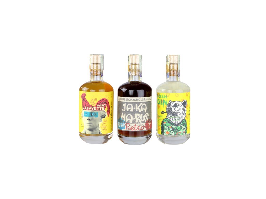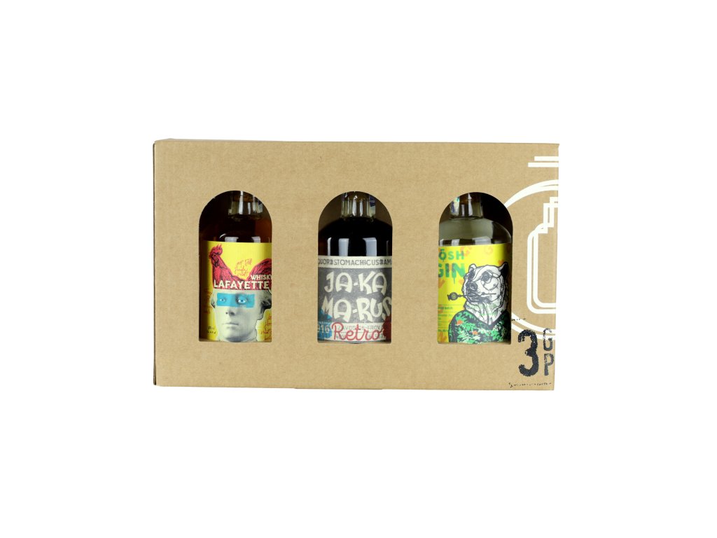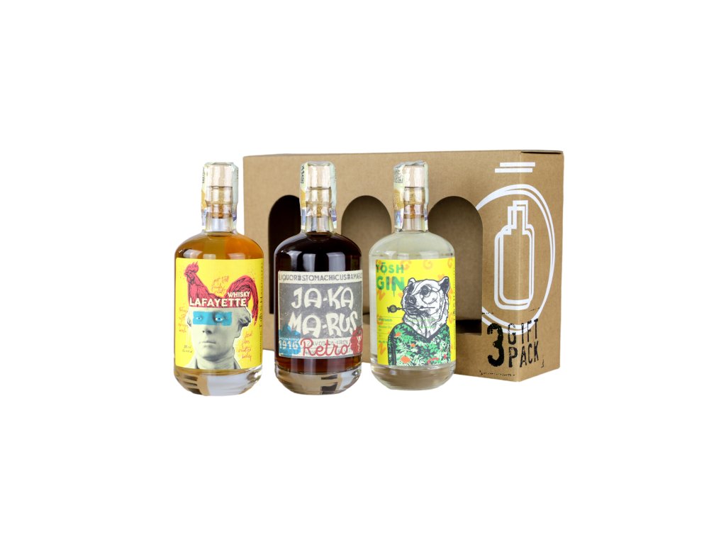 Dárkové degustační balení: Řemeslný TŌSH Gin se silnou a vyváženou chutí citrusů, jalovce a máku. Nenakuřovaná svěží whisky Lafayette ze sudů po červeném víně. Bylinný prvorepublikový likér Jakamarus z dubových sudů.
