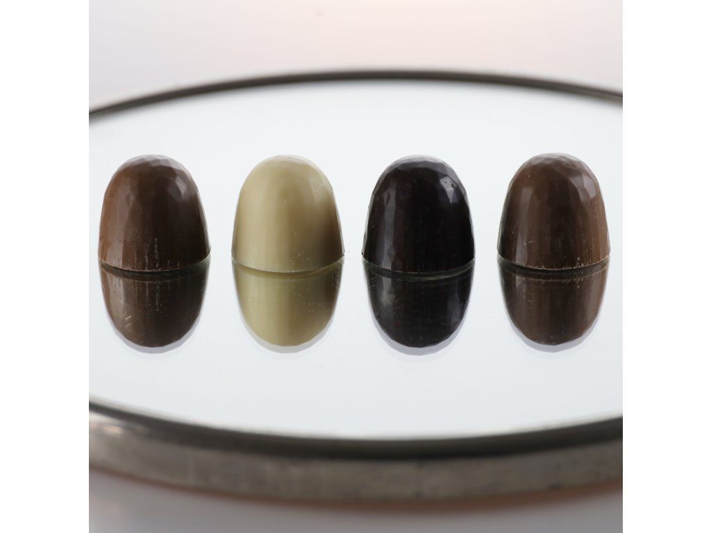 Složení: obsah kakaové sušiny dle pralinky 31,1 %, 34 %, 64 %, kakaová hmota, kakaové máslo, cukr, sušené mléko, emulgátor: sójový lecitin, přírodní vanilka, velejemný líh, jalovec, citrusové kůry, kubébový pepř, český mák, moravský sladkoplodý jeřáb, šípek, další byliny a koření.