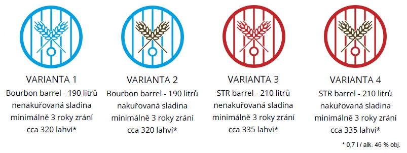 Vaší volbou bude použití buď sladu nakuřovaného českou rašelinou, či sladu nenakouřeného. Takovýto destilát pak podle vaší volby uložíme ke zrání do dvou možných druhů sudu.