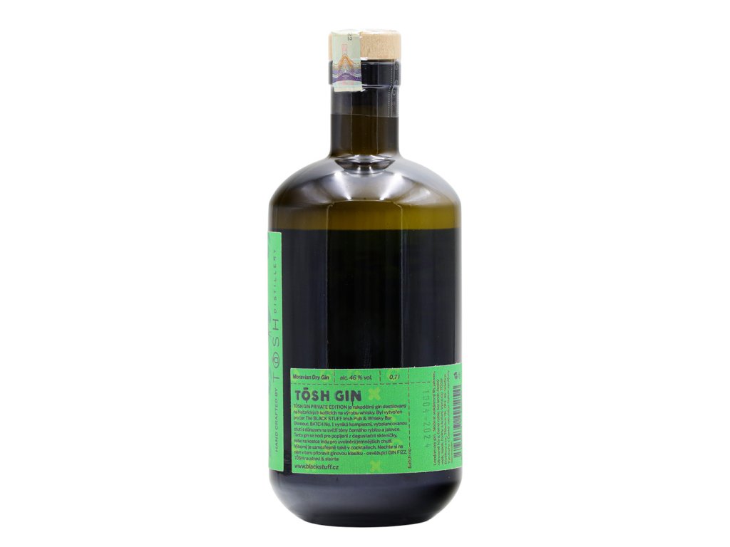 Rukodělný gin londýnského typu. Žádný přidaný cukr či dochucovadla. Single shot gin. Komplexní chuť, svěží tóny černého rybízu a jalovce. Speciální edice vyrobená pro legendární bar Black Stuff v Olomouci.